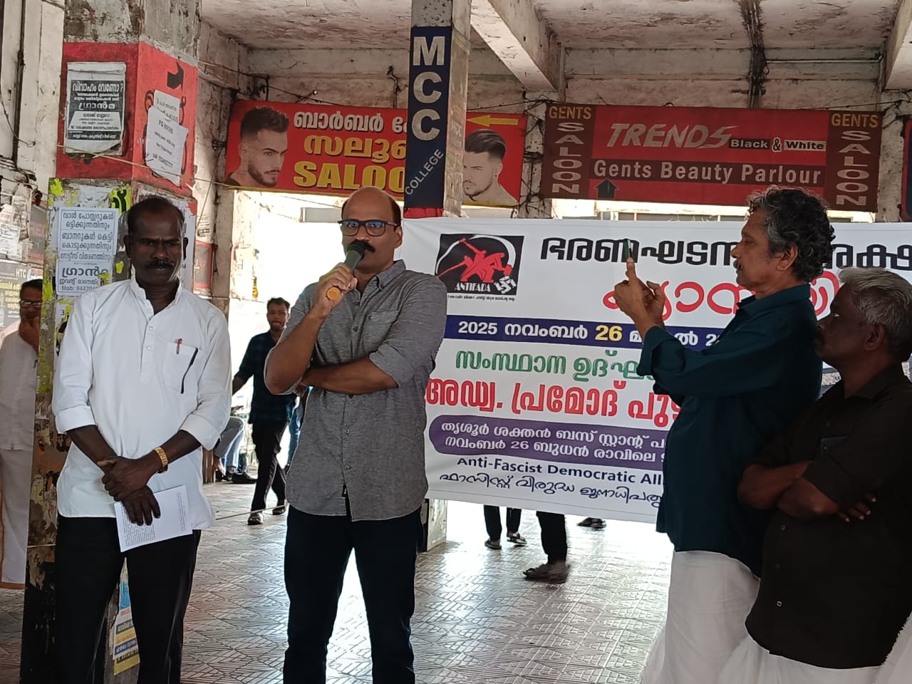 മതേതര, ജനാധിപത്യ കാഴ്ചപ്പാടുകളെ കയ്യൊഴിഞ്ഞു കൊണ്ട് ന്യൂനപക്ഷ സമുദായങ്ങളെയും മർദ്ദിത ജനവിഭാഗങ്ങളെയും ലക്ഷ്യം വച്ചു വർദ്ധമാനമായ  അക്രമണങ്ങൾ നിരന്തരം അഴിച്ചു വിടുന്ന ഫാസിസ്റ്റ് ശക്തികൾക്കെതിരെ രൂപീകരിച്ച ഫാസിസ്റ്റ് വിരുദ്ധ ജനാധിപത്യ സഖ്യത്തിൻ്റെ നേതൃത്വത്തിലാണ് ഭരണഘടനാ സംരക്ഷണ കാമ്പെയിൻ നടക്കുന്നതു്. കാമ്പെയിൻ്റെ സംസ്ഥാന തല ഉദ്ഘാടനം അഡ്വ. പ്രമോദ് പുഴങ്കര തൃശൂർ ശക്തൻ ബസ് സ്റ്റാൻഡ് പരിസരത്ത് ചേർന്ന യോഗത്തിൽ ഉദ്ഘാടനം ചെയ്തു.